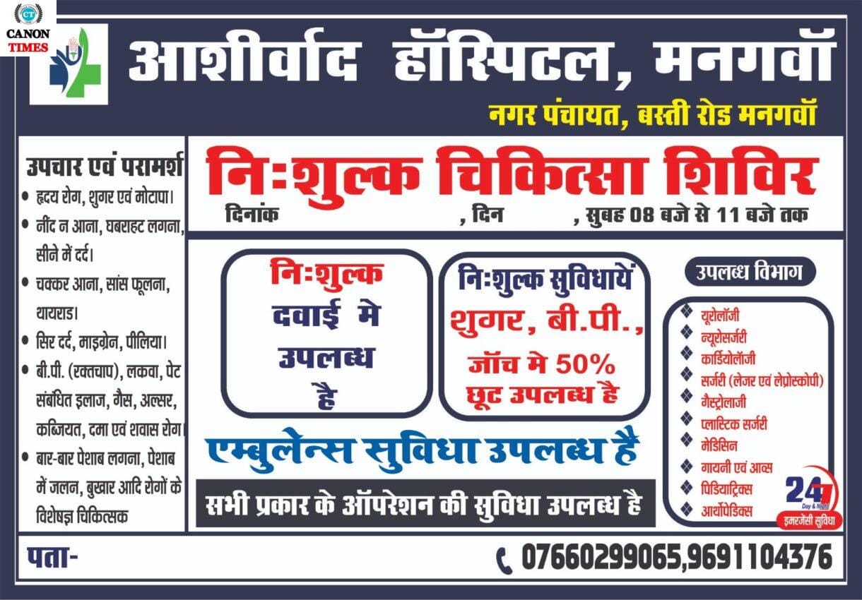 आशीर्वाद हॉस्पिटल मनगवां की तरफ से निःशुल्क चिकित्सा शिविर लगाया गयाl